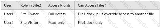 How many files in Site2 can User1 and User2 access after you turn on DLPpolicy1? To answer, select the appropriate options in the answer area.