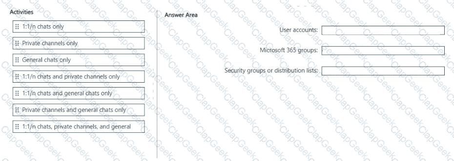 Which entities can you protect by applying a data loss prevention (DLP) policy to each resource? To answer, drag the appropriate activities to the correct entity. Each activity may be used once, more than once, or not at all. You may need to drag the split bar between panes or scroll to view content.