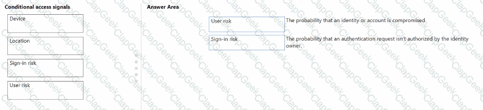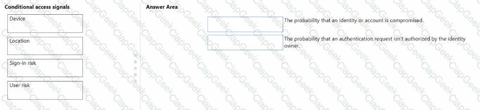 To answer, drag the appropriate Conditional Access signal type from the column on the left to its definition on the right. Each signal type may be used once, more than once, or not at all.