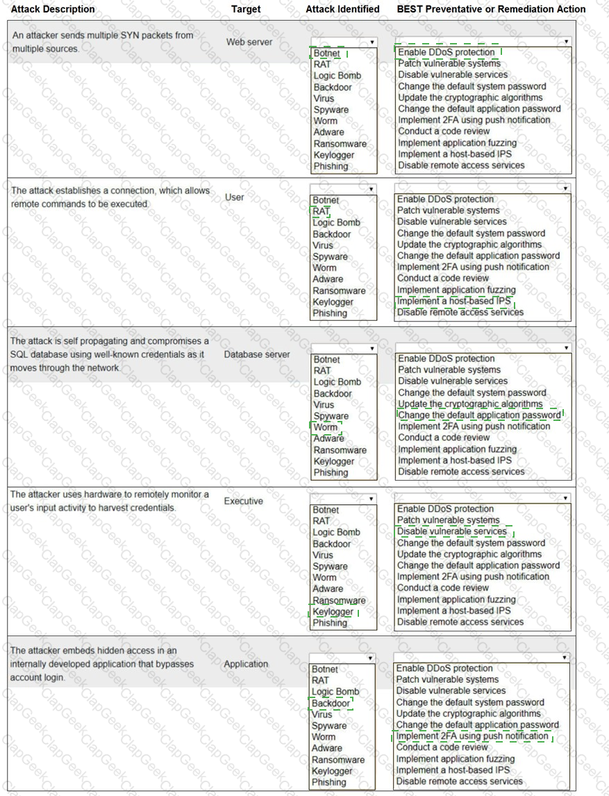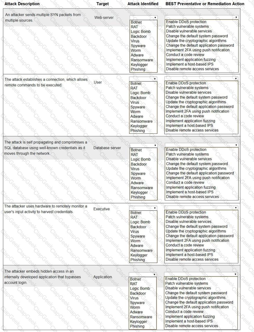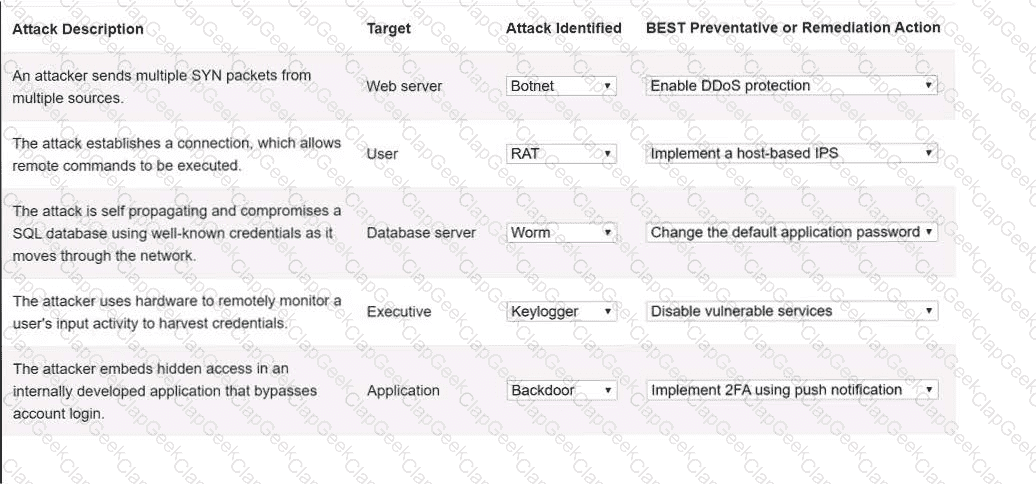 Select the appropriate attack and remediation from each drop-down list to label the corresponding attack with its remediation.